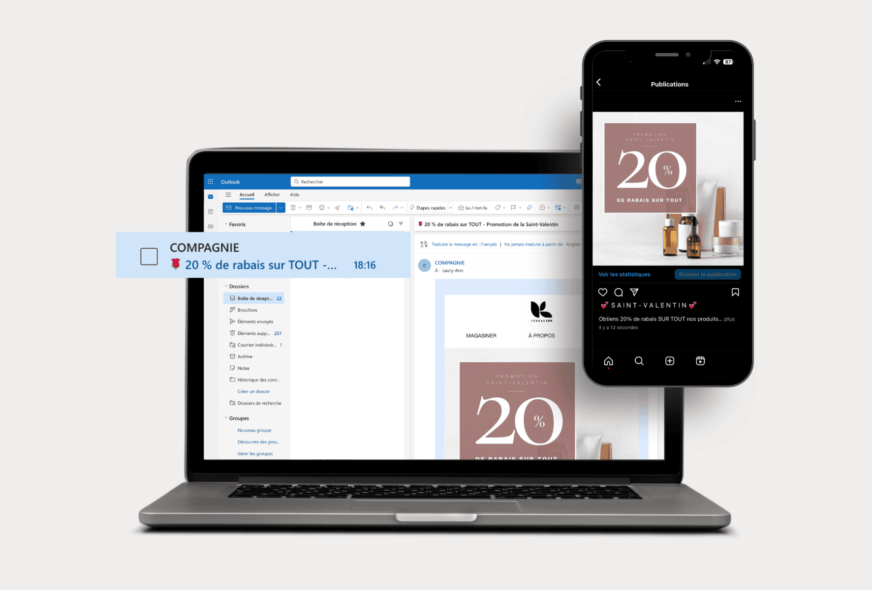Par exemple : «Promotion de la Saint-Valentin : 20% de rabais sur tout!»