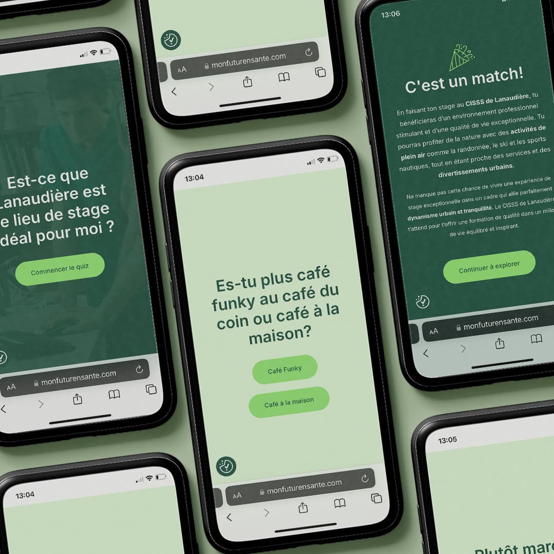 Afin de rendre l’expérience utilisateur plus engageante, un quiz interactif soutenu par une stratégie publicitaire sur META a été intégré directement sur le site web. Ce quiz, pensé comme un outil de gamification, permet aux utilisateurs de se projeter dans la région et de mesurer leur compatibilité avec le CISSS de Lanaudière. Il met en lumière l’équilibre unique entre nature et urbanité qu’offre le territoire, offrant une expérience immersive et personnalisée.